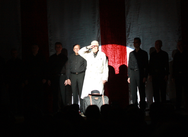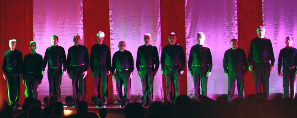 um Platz zu schaffen für „Axel-F“, von choralis intoniert und beschwingt choreographisch unterlegt. „Licht aus, Spot an“ hieß es früher zu „Disco“-Zeiten, so auch beim MGV, was jedoch kam, war ein Mann im Trenchcoat mit Koffer und Hut, der dachte, dass er noch niemals in New York war. Der Männerchor nahm prompt seinen Gedanken mit Udo Jürgens Titel auf und wurde mit tosendem Beifall belohnt.