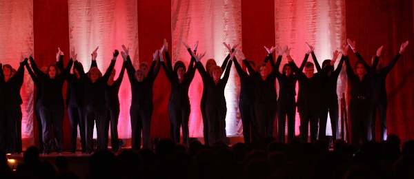 Nicht minder spektakulär erwies sich die zweite Hälfte des Programms. „Viva la Vida“ es lebe das Leben stimmte der Jugendchor das Publikum ein, ganz anders als der Frauenchor, der mit „Angel passing through the Room“ eine übernatürliche Atmosphäre schaffte. Erstarrt wie Baumstämme zeigten sich die Sängerinnen fast im Dunkeln und wurden von imaginären illuminierten Engeln umschwebt. Gerade „On top of the World“ angekommen, wurden die Damen von der Bühne gescheucht,