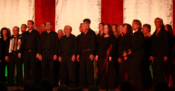 Was folgte war ein Bühnenprogramm von leisen Tönen bis hin zu fetzigen Popsongs und Gassenhauern, die das Publikum kaum auf den Stühlen hielt. Perfektioniert wurde die Bühnenpräsentation durch phantasievoll eingebrachte Lichteffekte. Alle Chorformationen hatten ihre Darbietungen passend in Szene gesetzt. Das hatte nichts mehr mit den eher angestaubten Chorkonzerten zu tun!